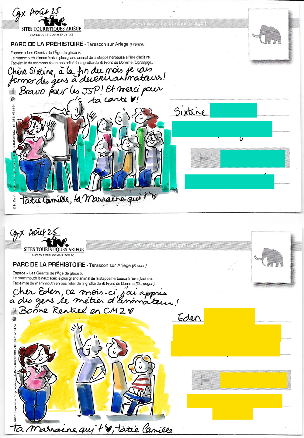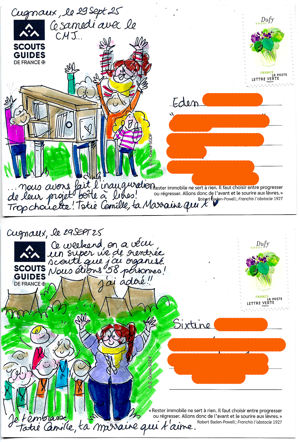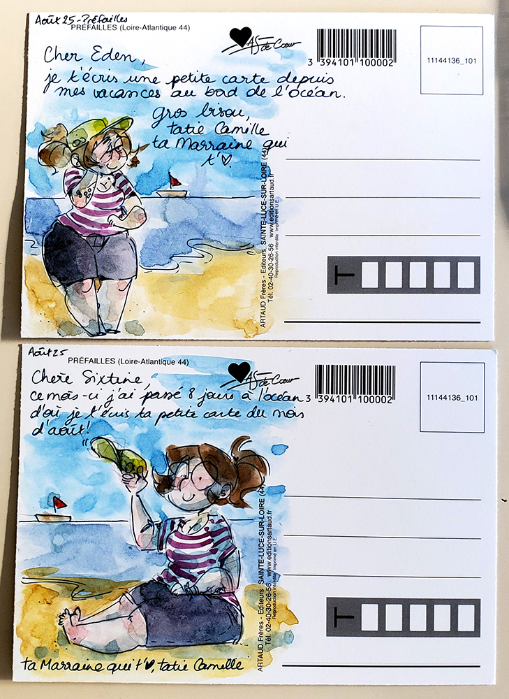 Go faire le point sur les cartes postales envoyées à mes filleul·es !! :]