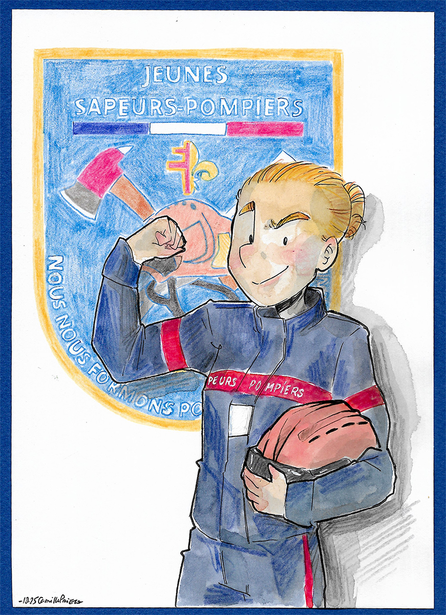 Chaque année Aline me file une idée de dessin pour elle. Le thème c'est un peu ses héros et héroïnes. y'a eu Cerise, les enfants de la resistance, sont sport et.. Et là, cette année, Sixtine fait partie des Jeunes Sapeurs Pompiers.